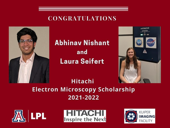Image Hitachi Electron Microscopy Scholarship June 1, 2021 Congratulations to Abhinav Nishant and Laura Seifert, recipients of the Hitachi Electron Microscopy Scholarship for 2021/2022. Hitachi High Technologies established this award as part of their partnership with the University of Arizona in support of the Kuiper Materials Imaging and Characterization Facility. Read more
